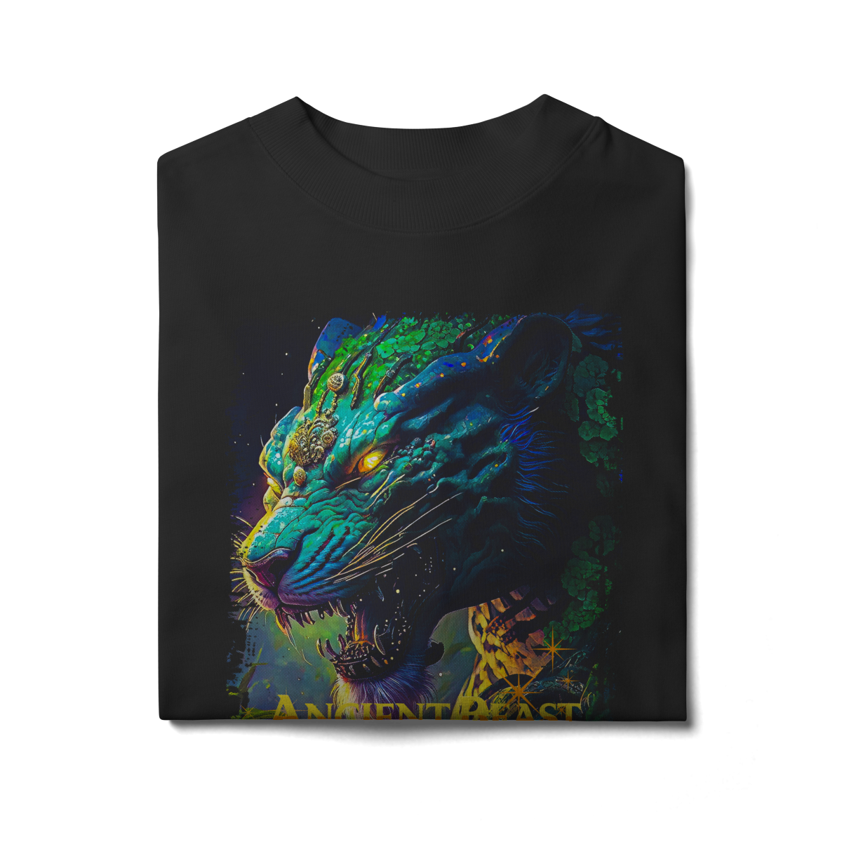 ANCIENT BEAST — COSMIC RAGE é uma estampa que representa a conexão entre o poder ancestral dos predadores e a energia infinita do cosmos. A arte traz a figura de uma fera mística em tons neon vibrantes — azul, verde, laranja e dourado — criando um visual hipnótico, agressivo e impossível de ignorar.