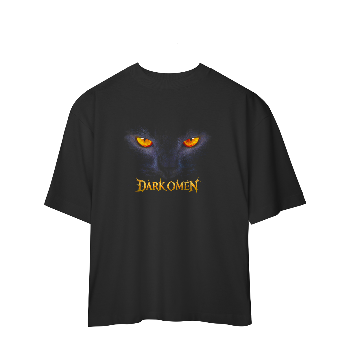 A estampa DARK OMEN — EYES OF THE NIGHT traz a força do instinto noturno representado por um gato envolto em sombras profundas, com olhos em tom âmbar intenso que atravessam o escuro. O contraste brutal entre o fundo preto absoluto e os olhos vibrantes cria uma estética hipnótica, misteriosa e provocante.