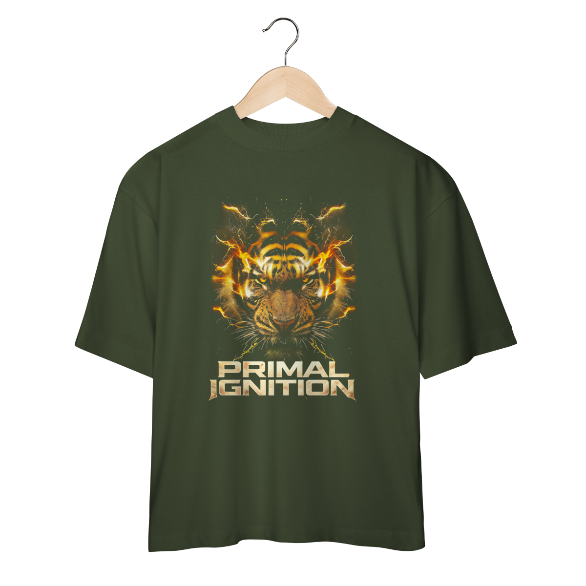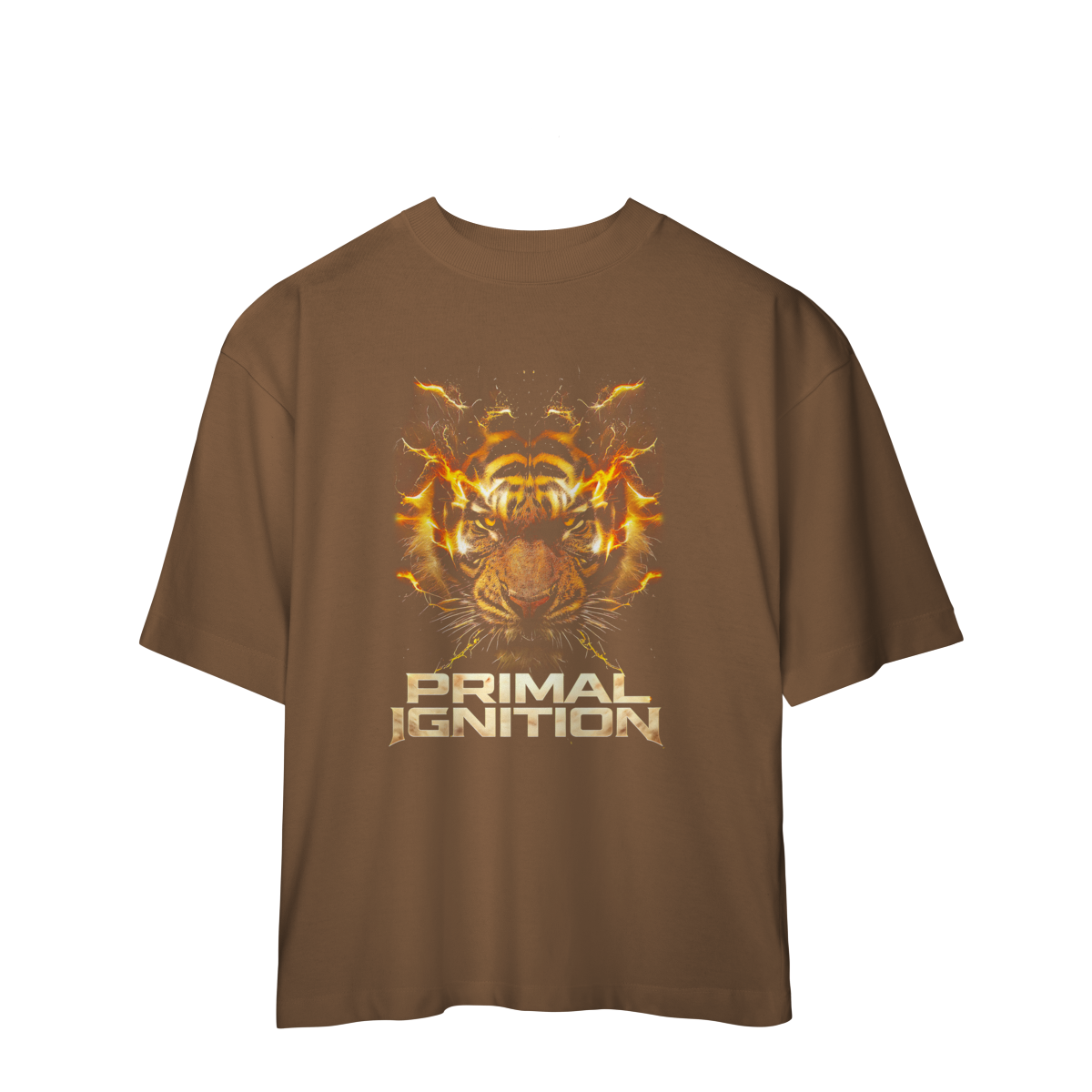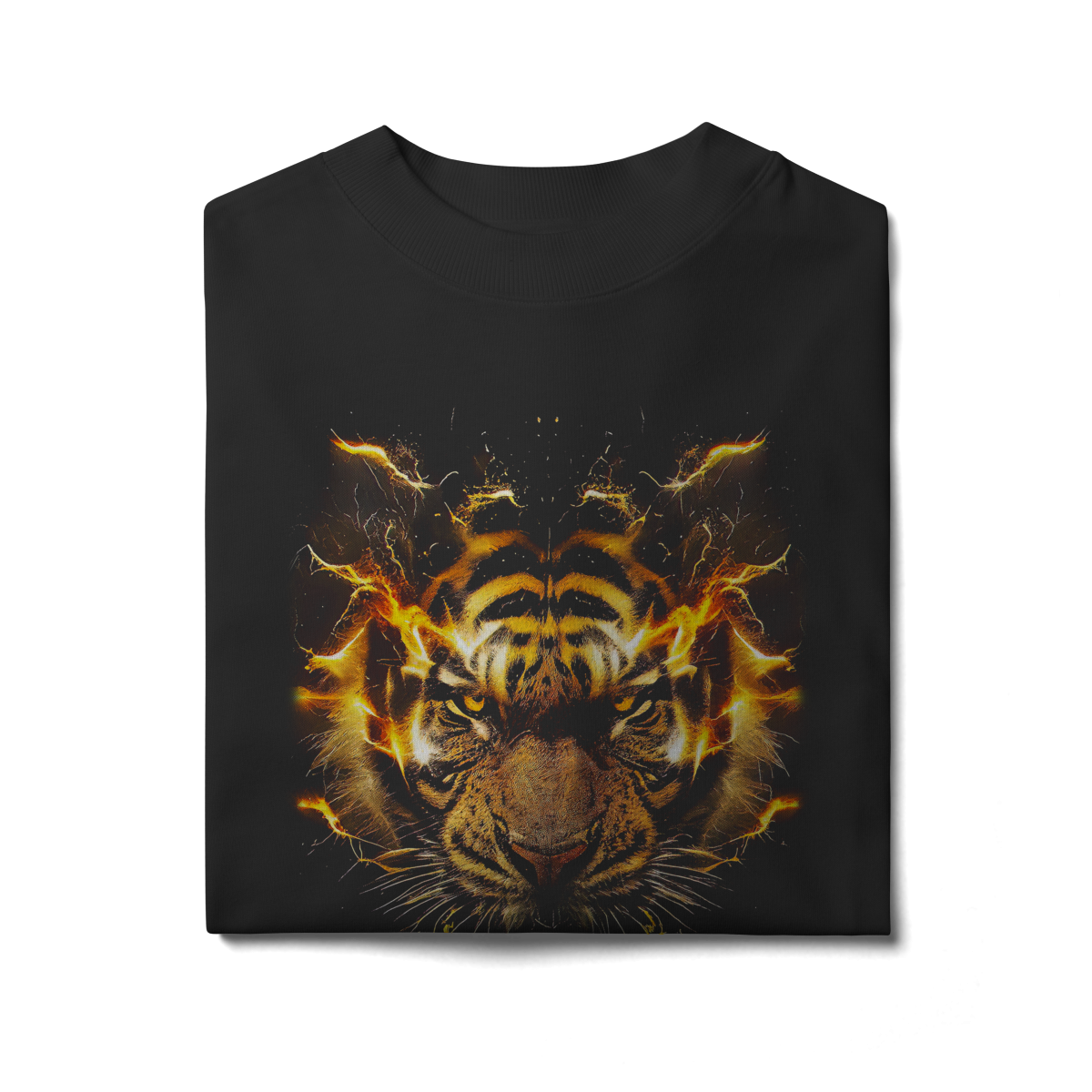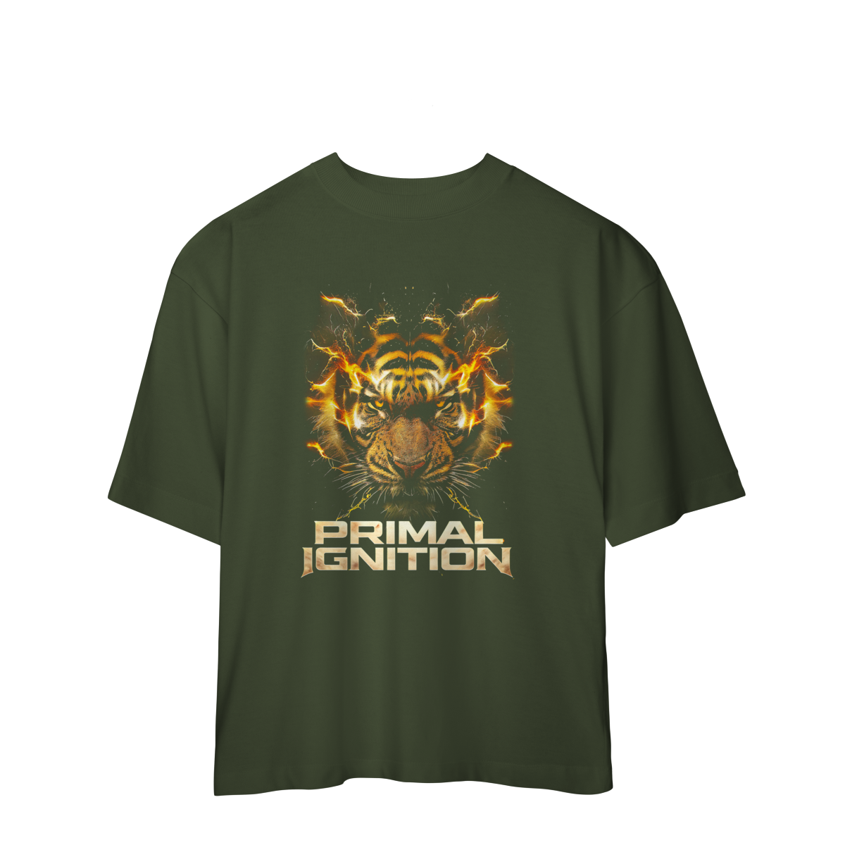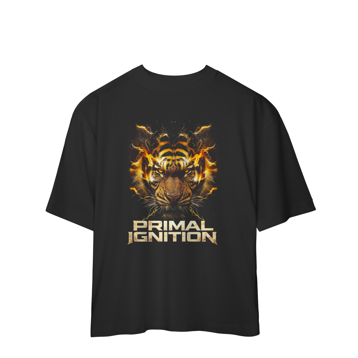 PRIMAL IGNITION — THUNDER TIGER representa o momento exato em que a força primitiva entra em combustão. O rosto do tigre surge envolto por descargas elétricas douradas, como se o próprio corpo estivesse em ignição. O olhar intenso transmite fúria controlada, domínio e prontidão para atacar.