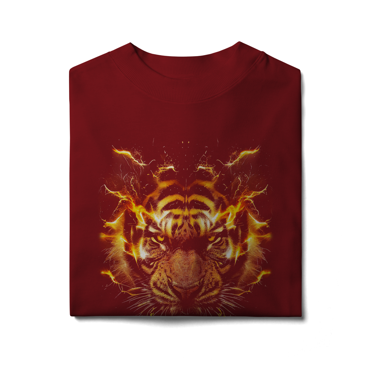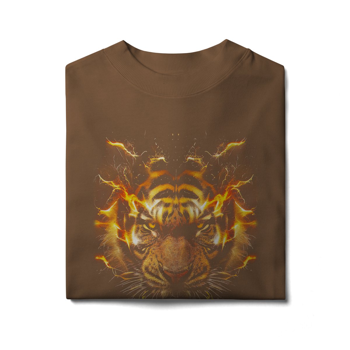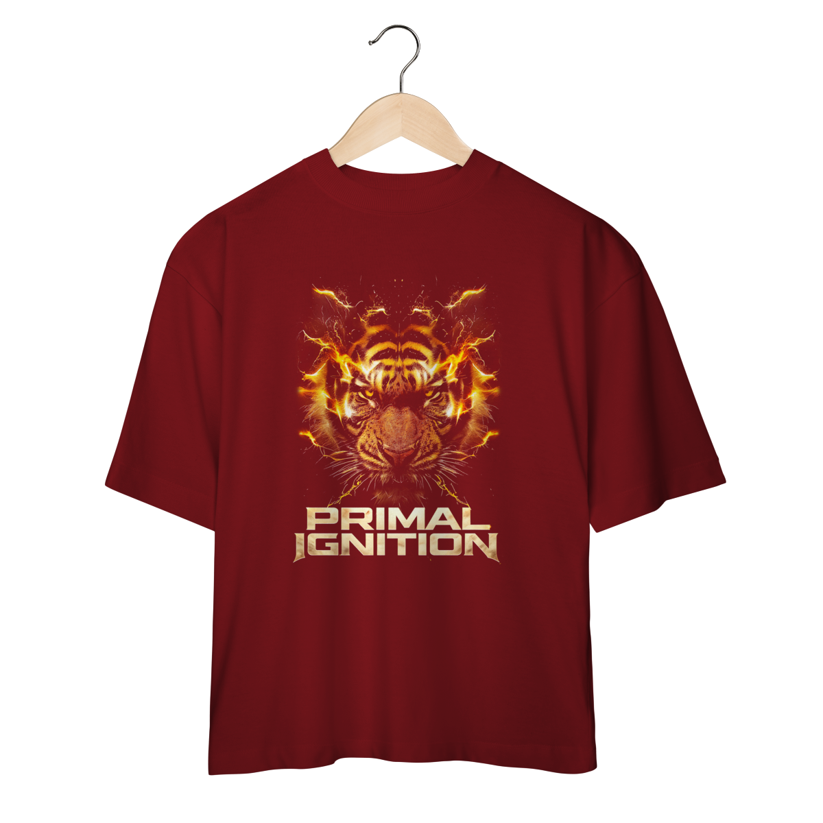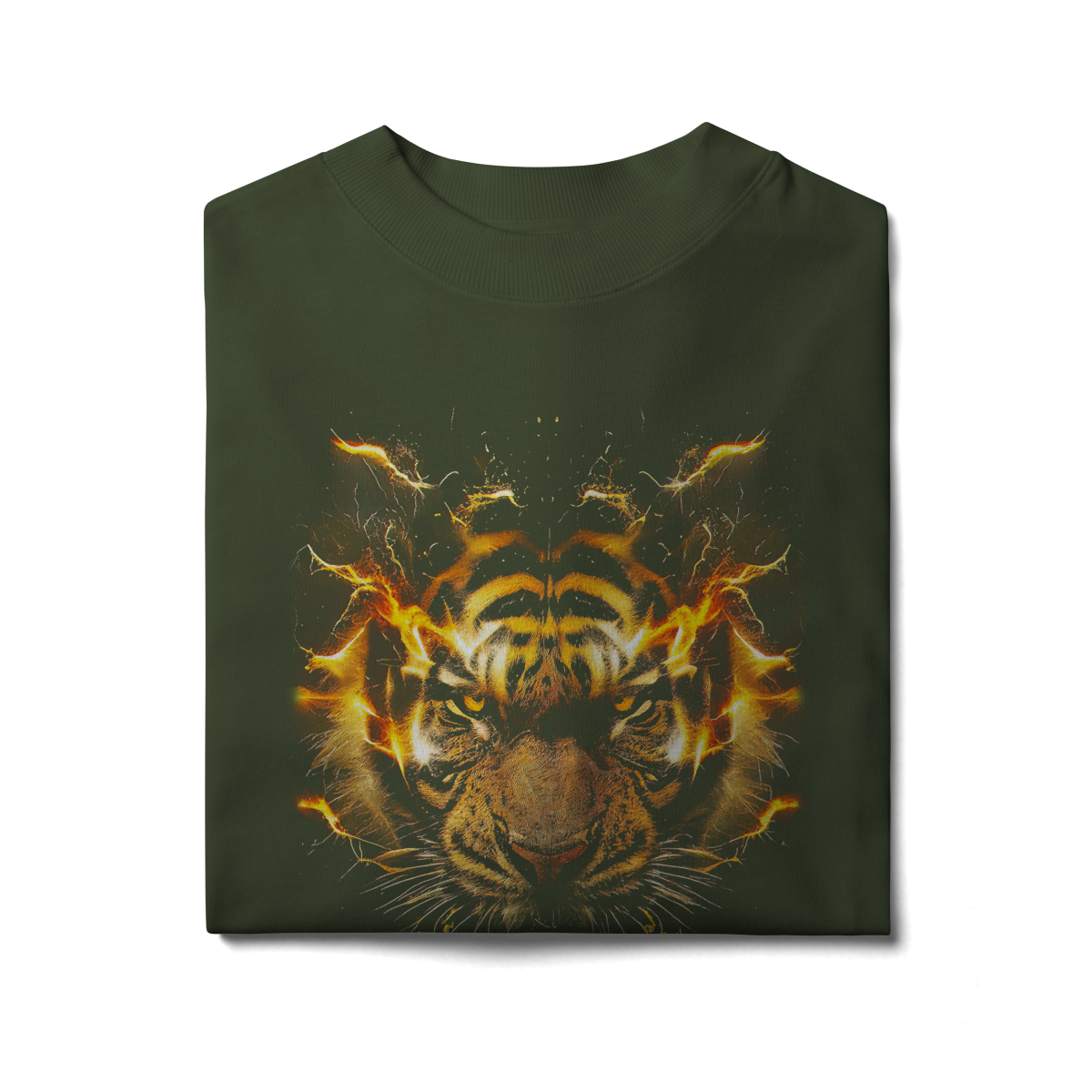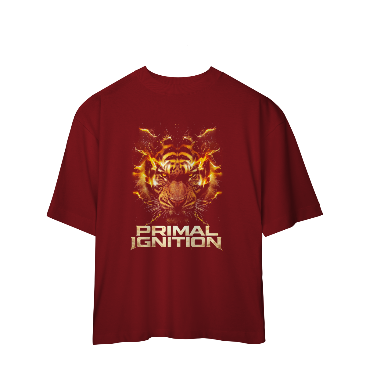 PRIMAL IGNITION — THUNDER TIGER representa o momento exato em que a força primitiva entra em combustão. O rosto do tigre surge envolto por descargas elétricas douradas, como se o próprio corpo estivesse em ignição. O olhar intenso transmite fúria controlada, domínio e prontidão para atacar.