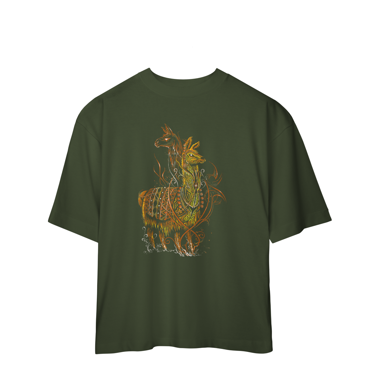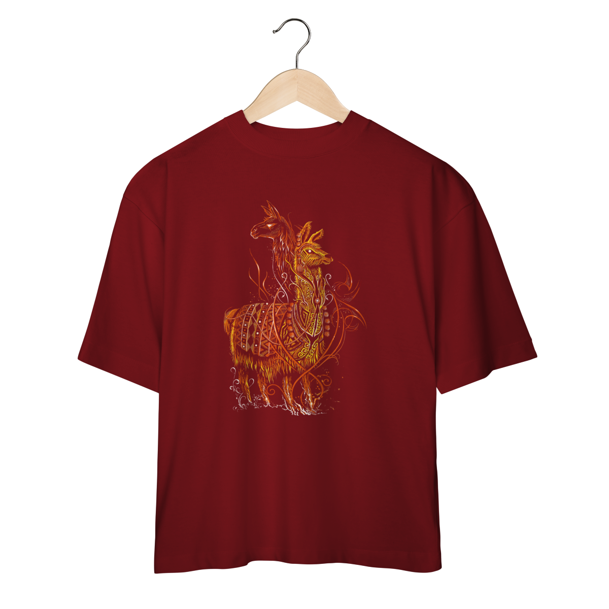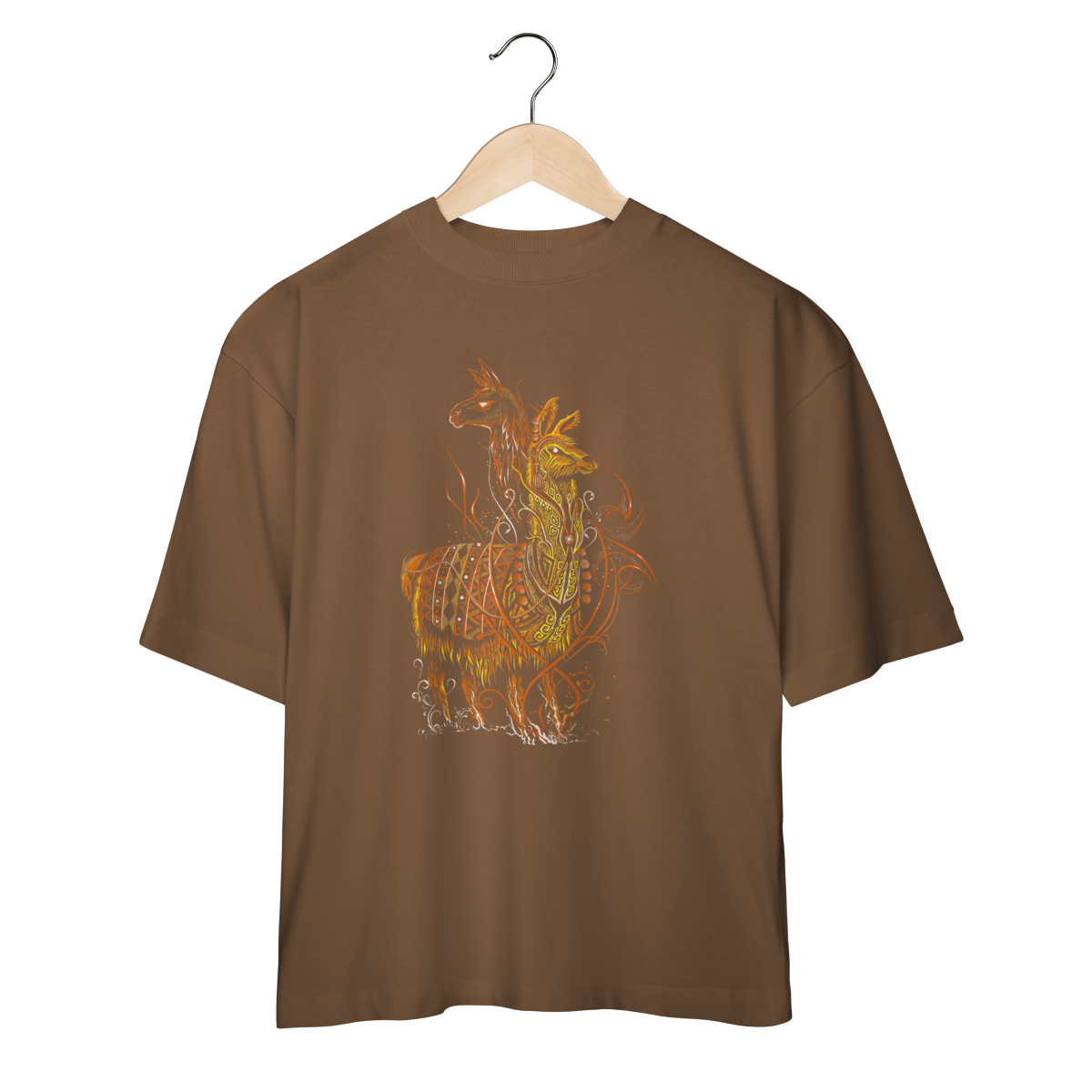 A estampa SACRED FLAME LLAMA representa o espírito guardião, símbolo de resistência, proteção e conexão espiritual. A arte mistura elementos tribais, padrões ancestrais e traços flamejantes em tons quentes de laranja e dourado, criando uma presença visual poderosa e hipnotizante.
