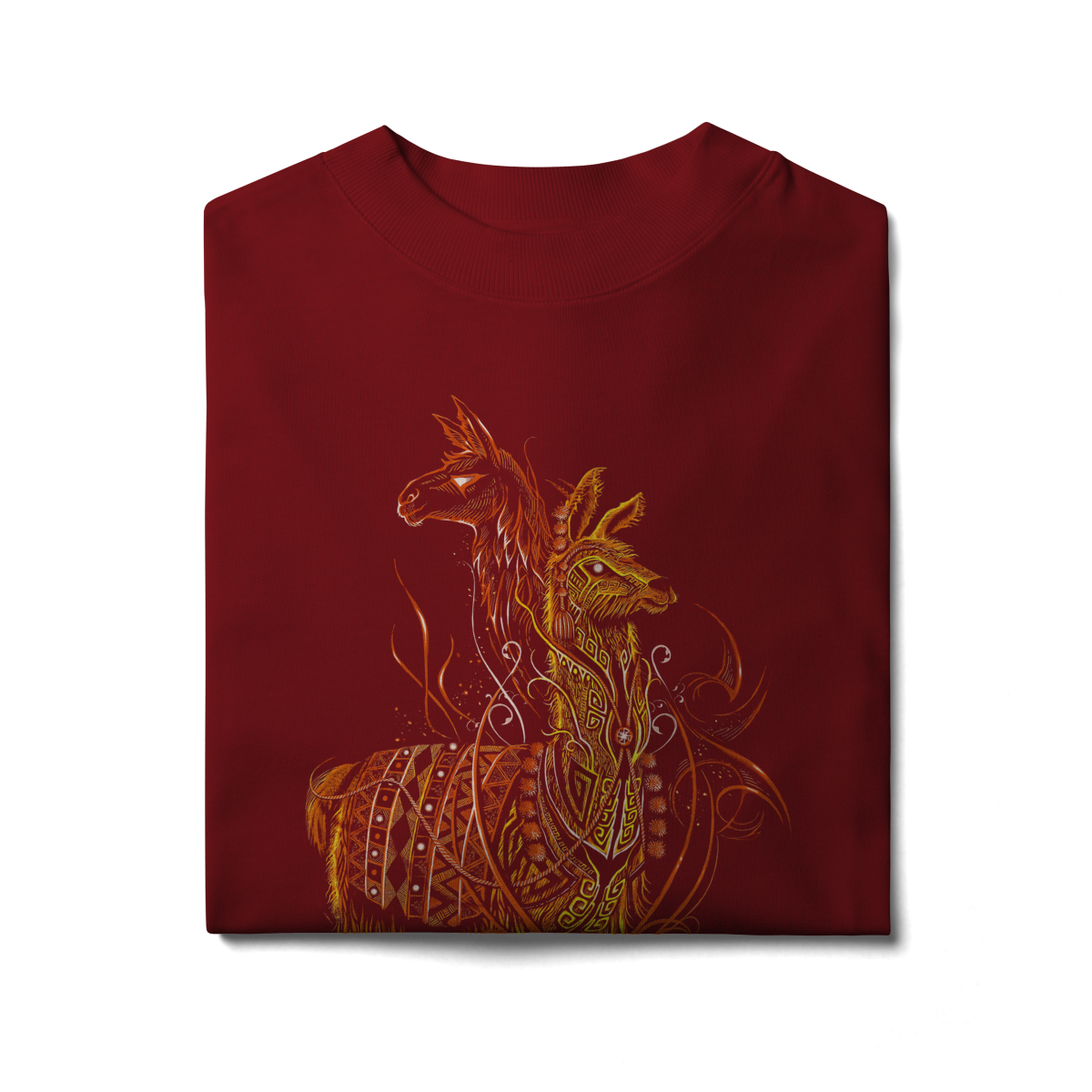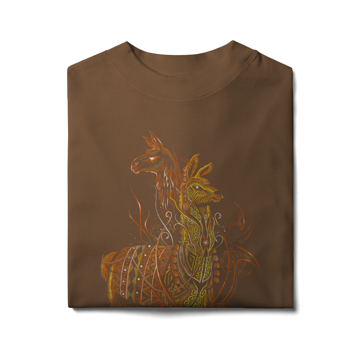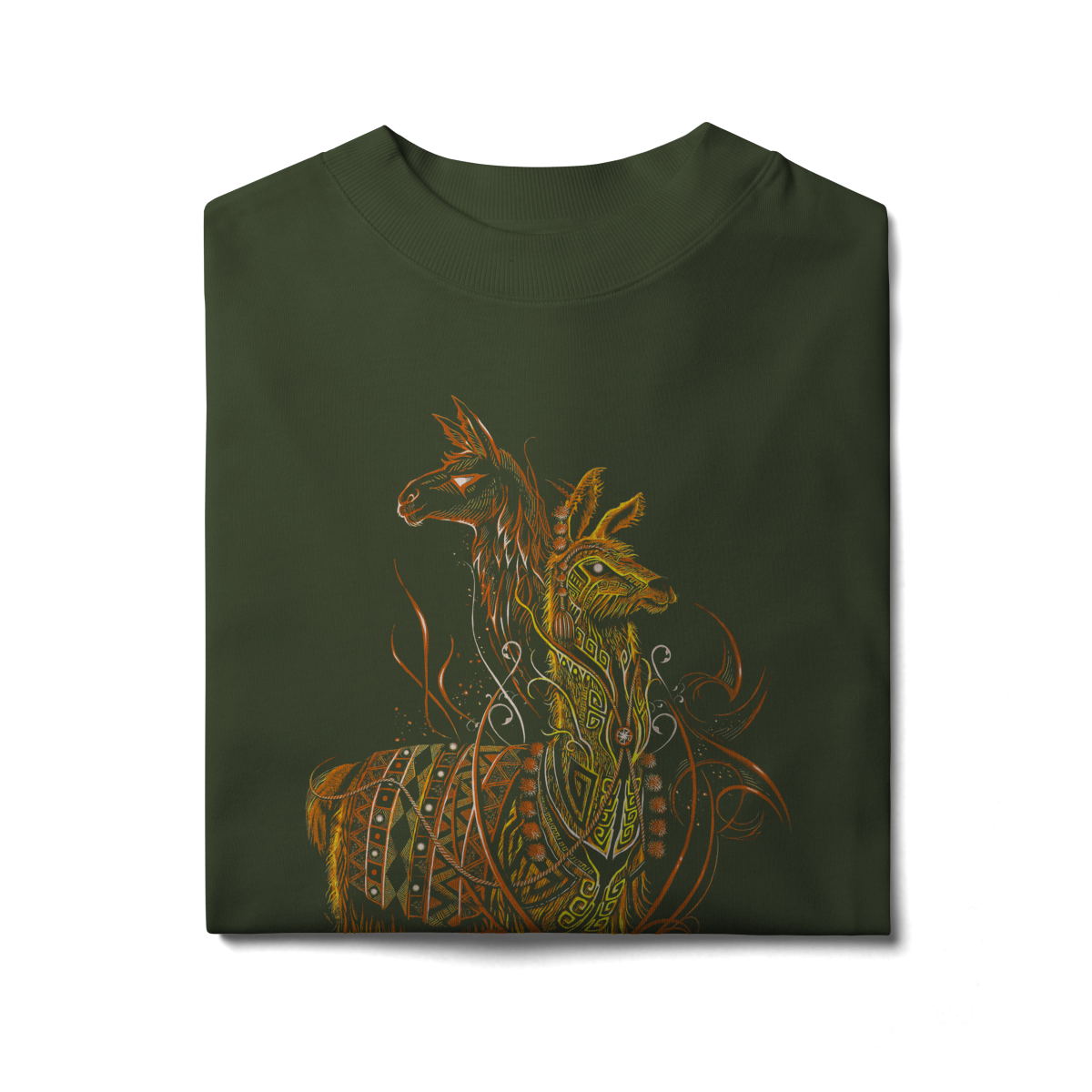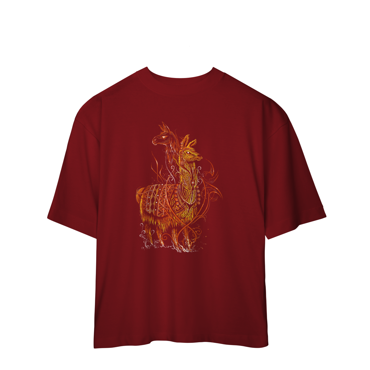 A estampa SACRED FLAME LLAMA representa o espírito guardião, símbolo de resistência, proteção e conexão espiritual. A arte mistura elementos tribais, padrões ancestrais e traços flamejantes em tons quentes de laranja e dourado, criando uma presença visual poderosa e hipnotizante.